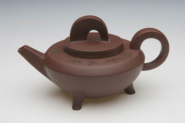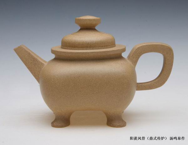 它吸取了传统经典壶式传炉壶的造型元素,进行再创造,此式中宫紧聚,四面开张,壶盖高耸,咀、把横向拉出 而富动感,四足迈开,使附件张扬的态势归于安定稳重,纽、盖、口、身、足从上而下,线型方圆交替节奏分明,气势恢弘。