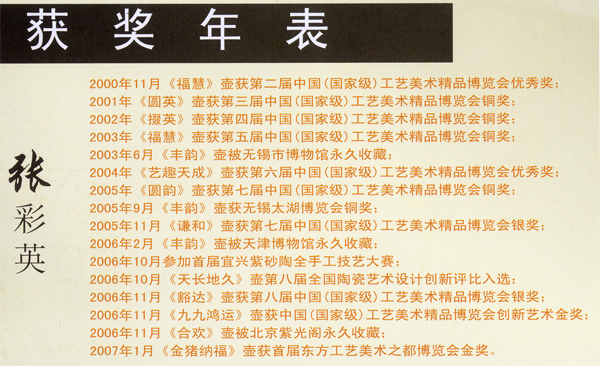 | 作品集 | 张彩英 | 女 | 江苏省宜兴紫砂工艺厂 | 制壶 | 正高级工艺美术师(乡土人才评审获得) | 2020-12-22 00:00:00 |