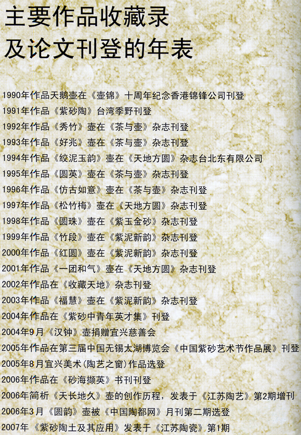 《谦和》、《豁达》壶获第六届、第七届中国工艺美术大师精品展银奖。《九九鸿运》获第八届中国工艺美术大师精品展创新艺术金奖。《合欢》、《丰韵》、《福慧》分别“紫光阁”、”天津市博物馆”、“无锡市博物馆”永久收藏。《丰韵》壶获得第二届工艺美术大师精品展优秀奖,《福慧》壶获第五届工艺美术大师精品展铜奖,《艺趣天成》获六届工艺美术大师精品展优秀奖,《谦和壶》获得第七届中国工艺美术大师精品博览会银奖,《天鹅壶》《秀竹壶》《谦和壶》等一批创新作品均获得了海内外收藏家褒奖。
